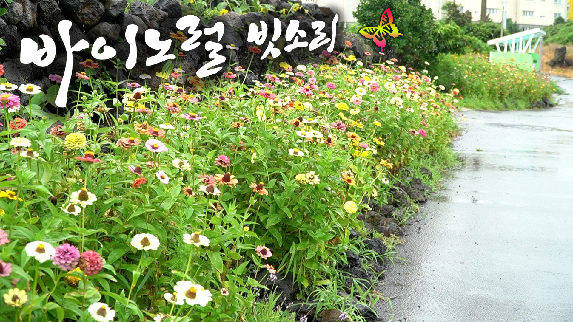 검은 돌담을 따라 한들 한들 거리는 꽃들과 우산위로 내리는 빗소리가 운치 있습니다.