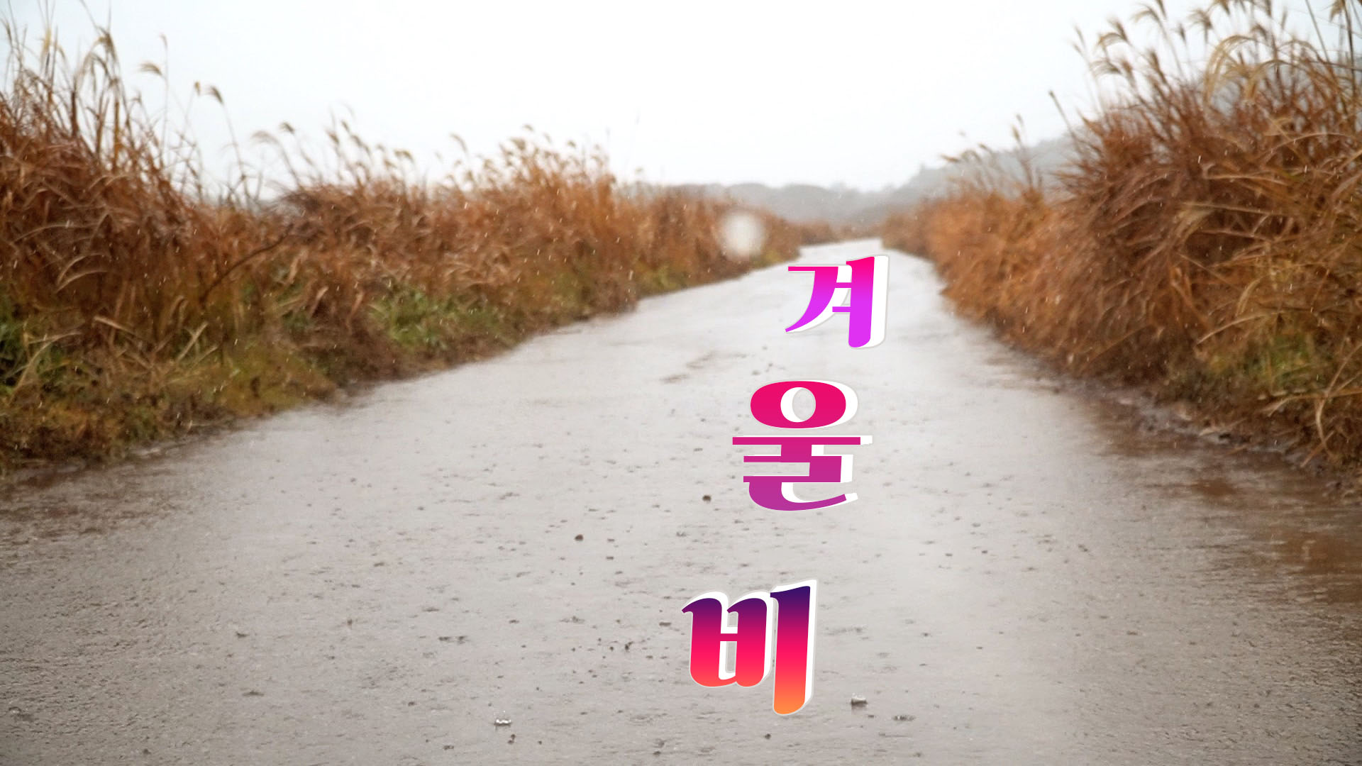 억새가 늘어선 시골 농로 길가에 겨울비가 내립니다.