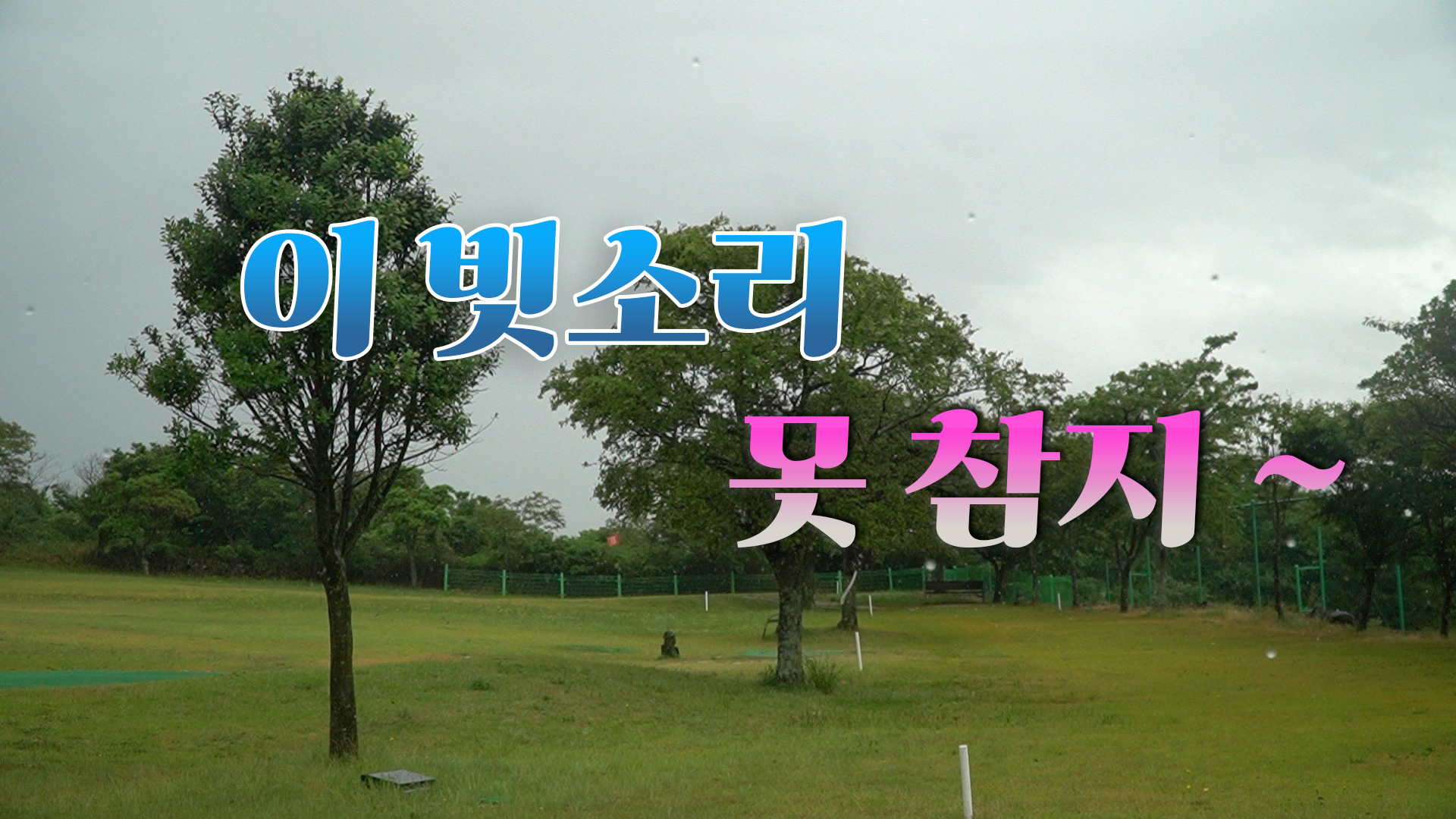 잔디가 푸르게 나있는 공원에 비가 내립니다.